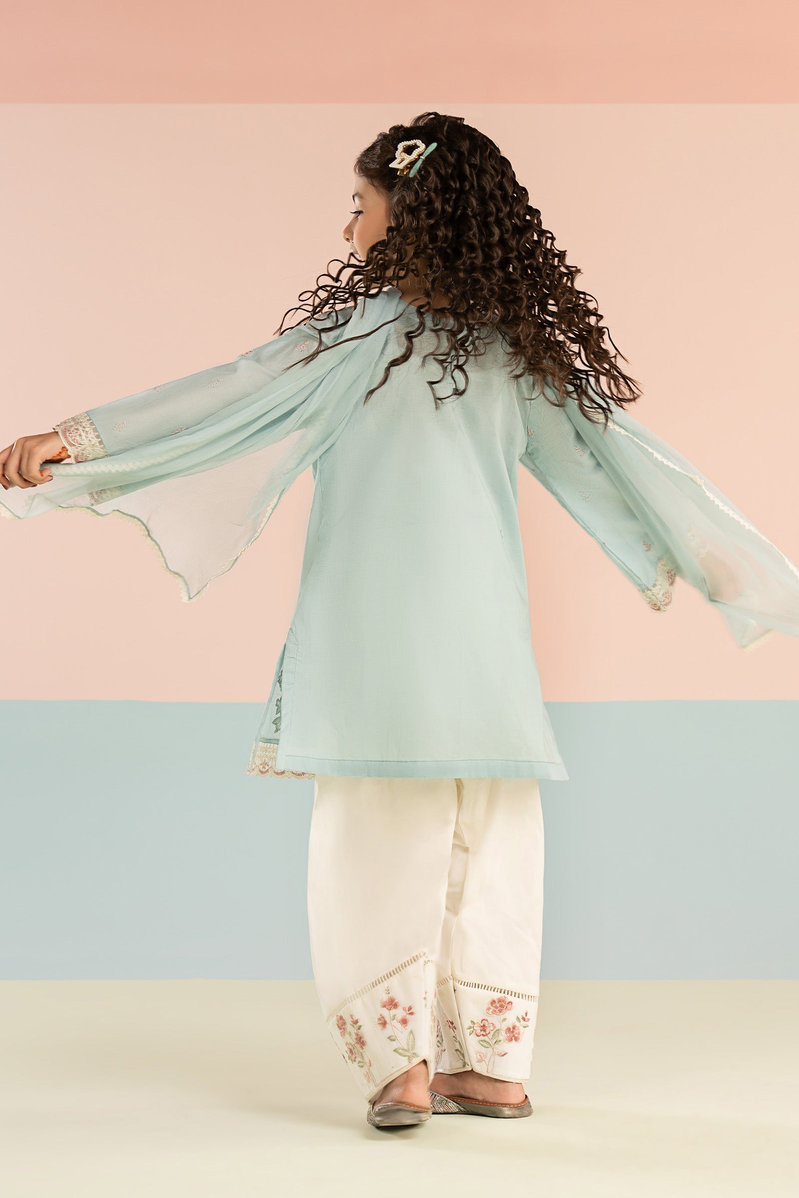 ShirtEmbroidered Neckline With Buttons DetailingSpray Embroidered Side Panels With MotifEmbroidered Border On Front PanelsEmbroidered Scalloped BorderEmbroidered SleevesColor: BlueFabric: LawnShalwarFarshi ShalwarElasticated WaistbandEmbroidered Border With Lace DetailingColor: WhiteFabric: CambricDupattaSolid DupattaFour-Side Lace BorderColor: Dusty PinkFabric: ChiffonWork Details: Sequin, Tilla & Thread EmbroideryModel is wearing 6-8 sizeNote: Dry Clean Only