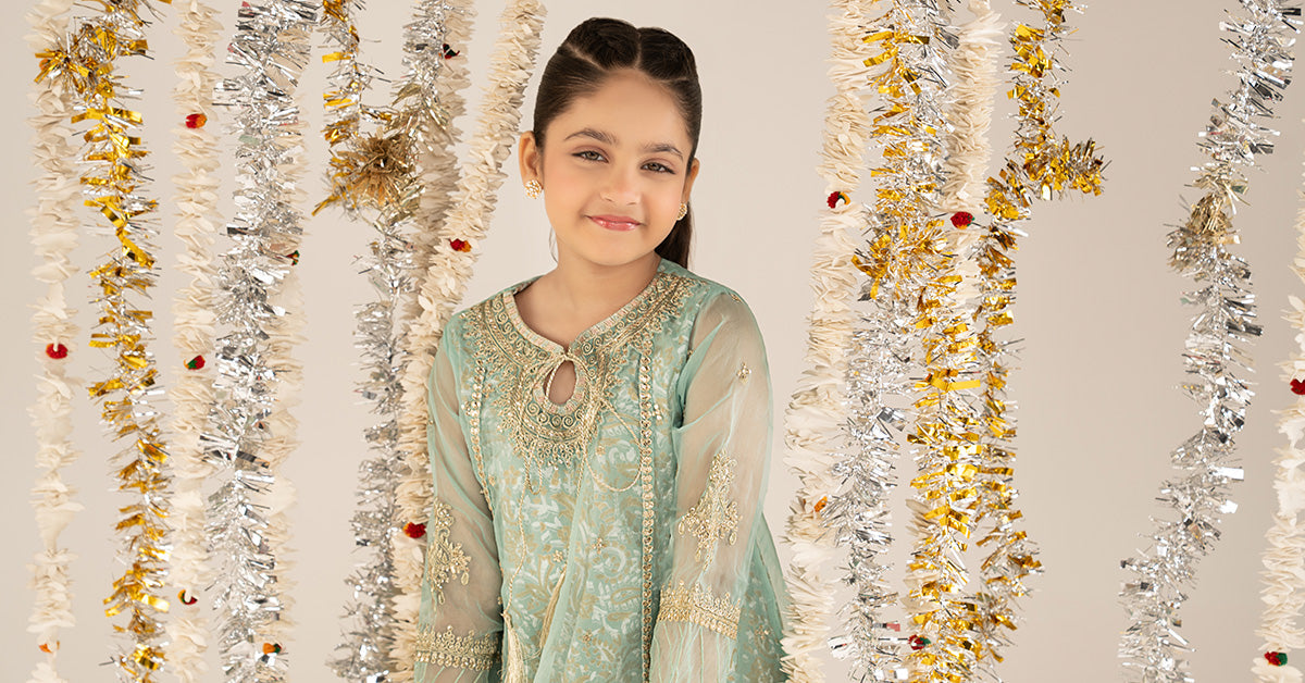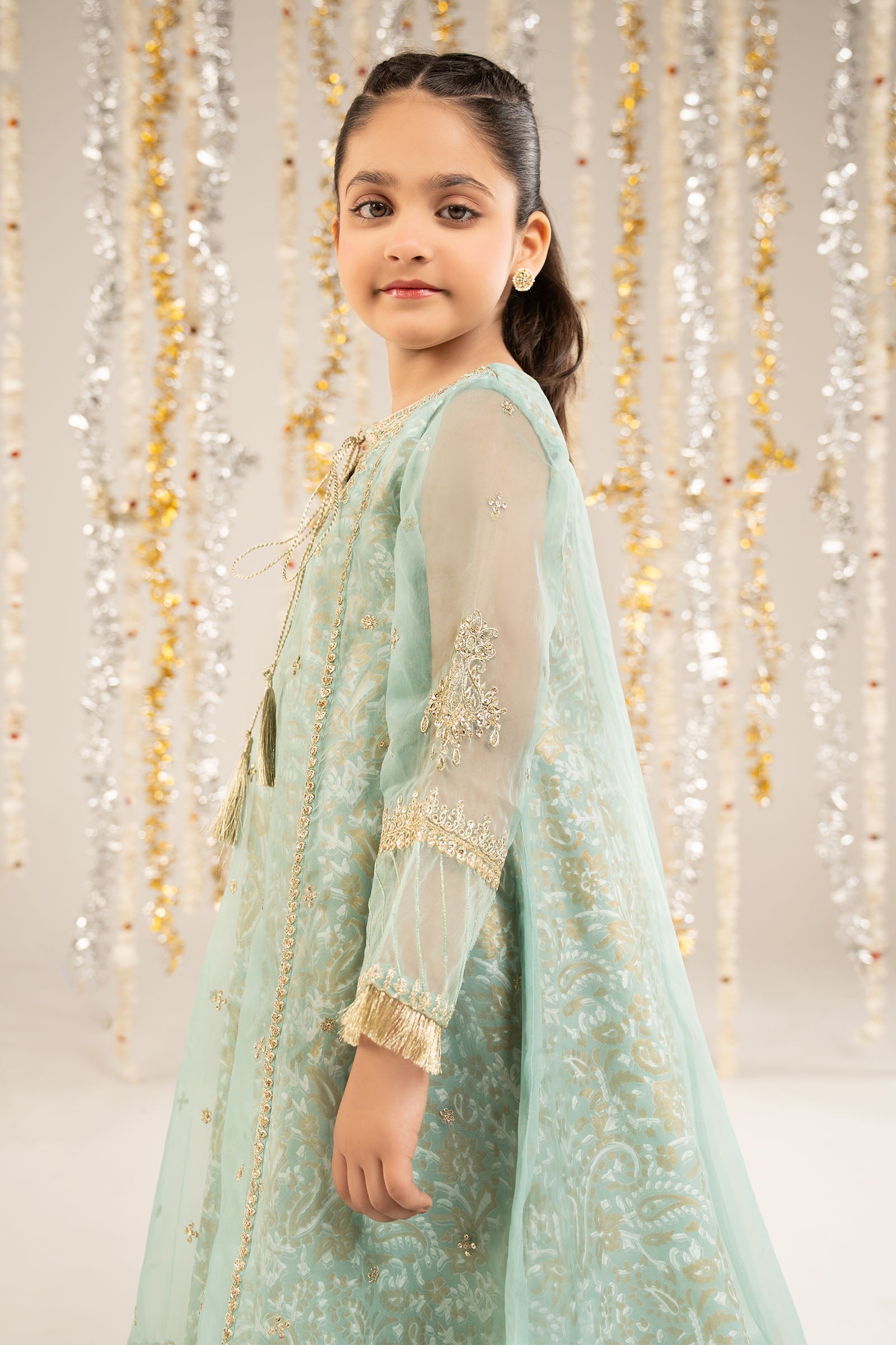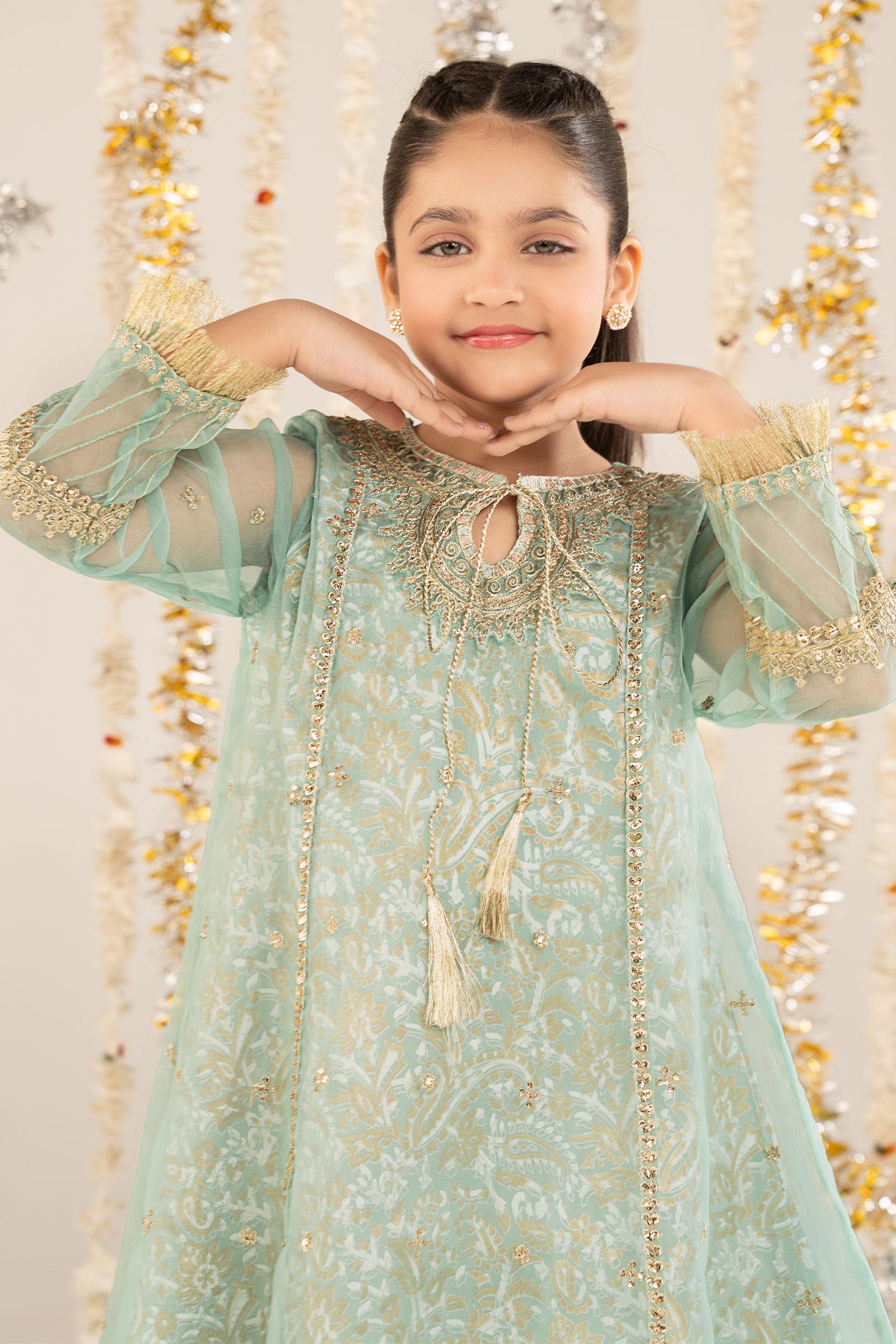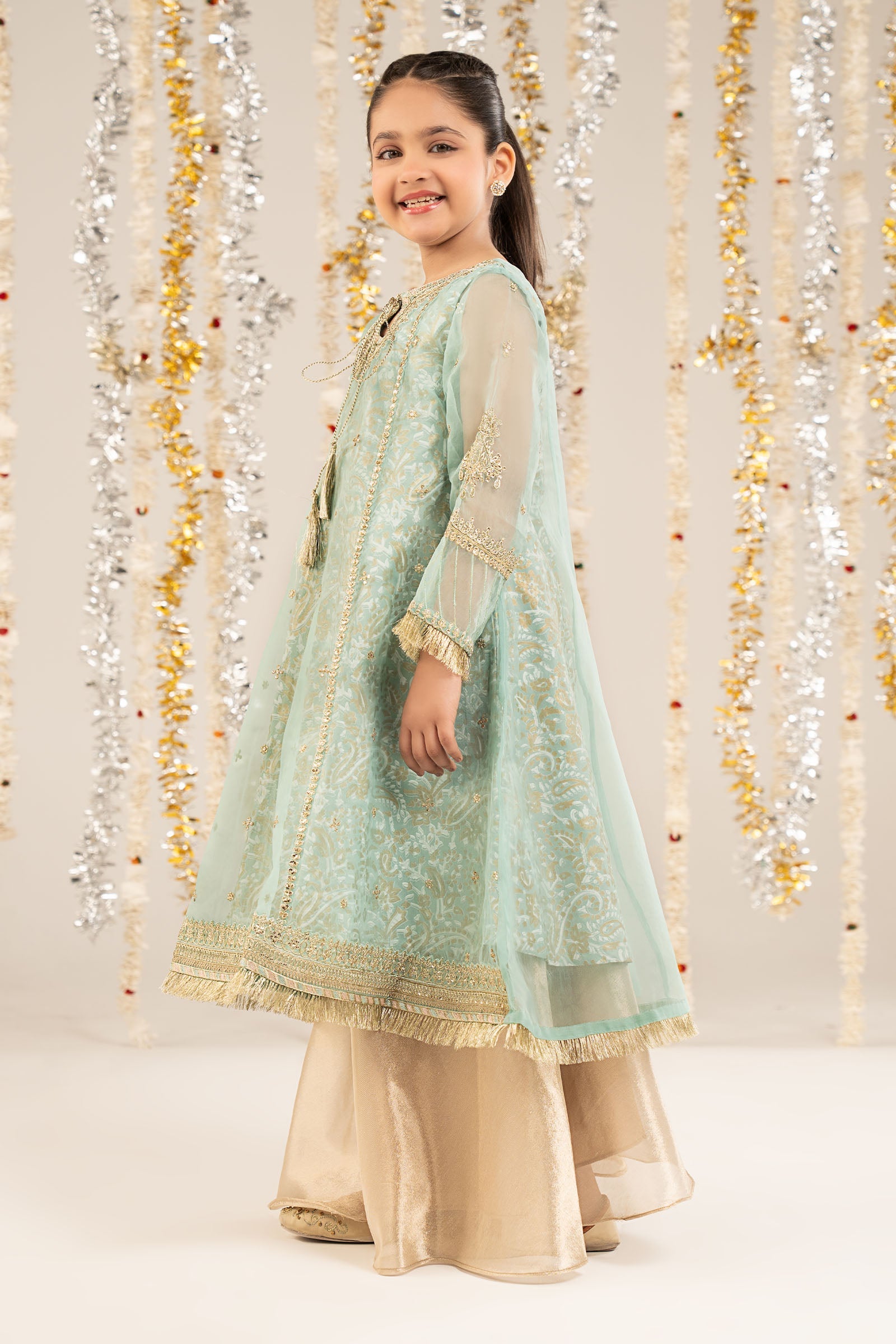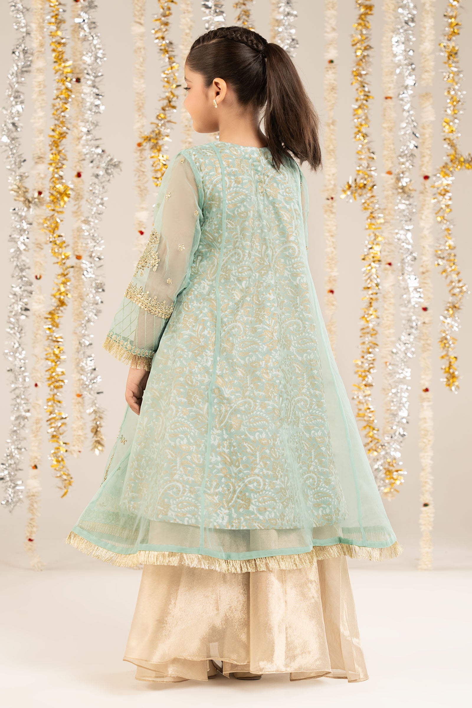 2 PieceShirt fabric: OrganzaTrouser fabric: TissueEmbroidered long frock with block printed undershirt featuring tassels paired with tissue sharara