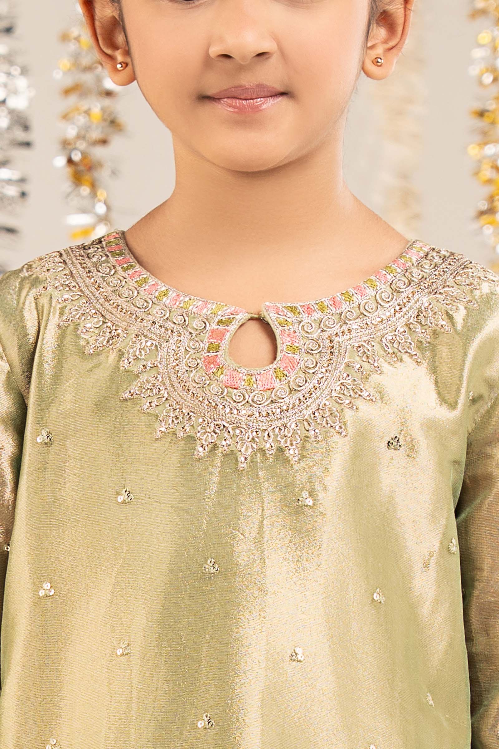 ShirtSpray Embroidered ShirtEmbroidered Kashmiri NecklineEmbroidered Side SeamsEmbroidered Scalloped BorderEmbroidered Straight SleevesSleeveless Resham Cotton Undershirt (Attached)Color: GreenFabric: TissueShararaSolid ShararaElasticated WaistbandGotta-Laced HemColor: GreenFabric: Raw SilkDupattaSolid DupattaTwo-Side Kiran BorderColor: PinkFabric: ChiffonWork Details: Sequin, Tilla & Thread EmbroideryModel is wearing 6-8 sizeNote: Dry Clean Only