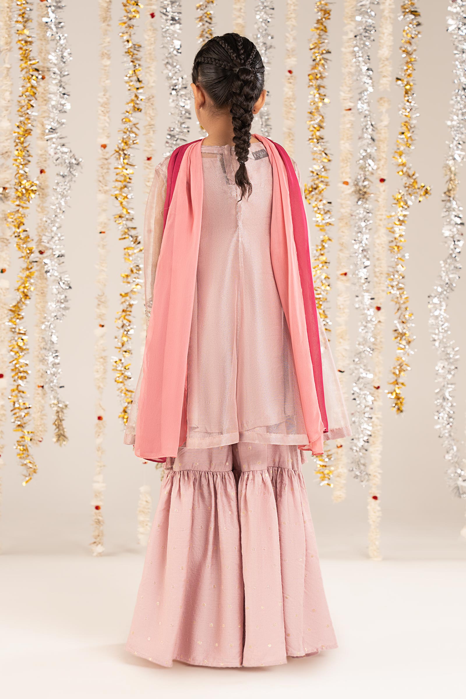 ShirtFront-Open ShirtEmbroidered NecklineEmbroidered Front-Open SlitGotta Lace On Front Panel BordersLoops & Tassel Detailing On Side SeamsEmbroidered Border With Gotta DetailingStraight Sleeves With Gotta Lace Embroidered BorderSleeveless Resham Cotton Undershirt (Attached)Color: LilacFabric: Zari NetGhararaLurex Woven GhararaElasticated WaistbandEmbroidered BorderColor: LilacFabric: Lurex JacquardDupattaSolid DupattaColor: Red & MagentaFabric: ChiffonWork Details: Sequin, Tilla & Thread EmbroideryModel is wearing 6-8 sizeNote: Dry Clean Only