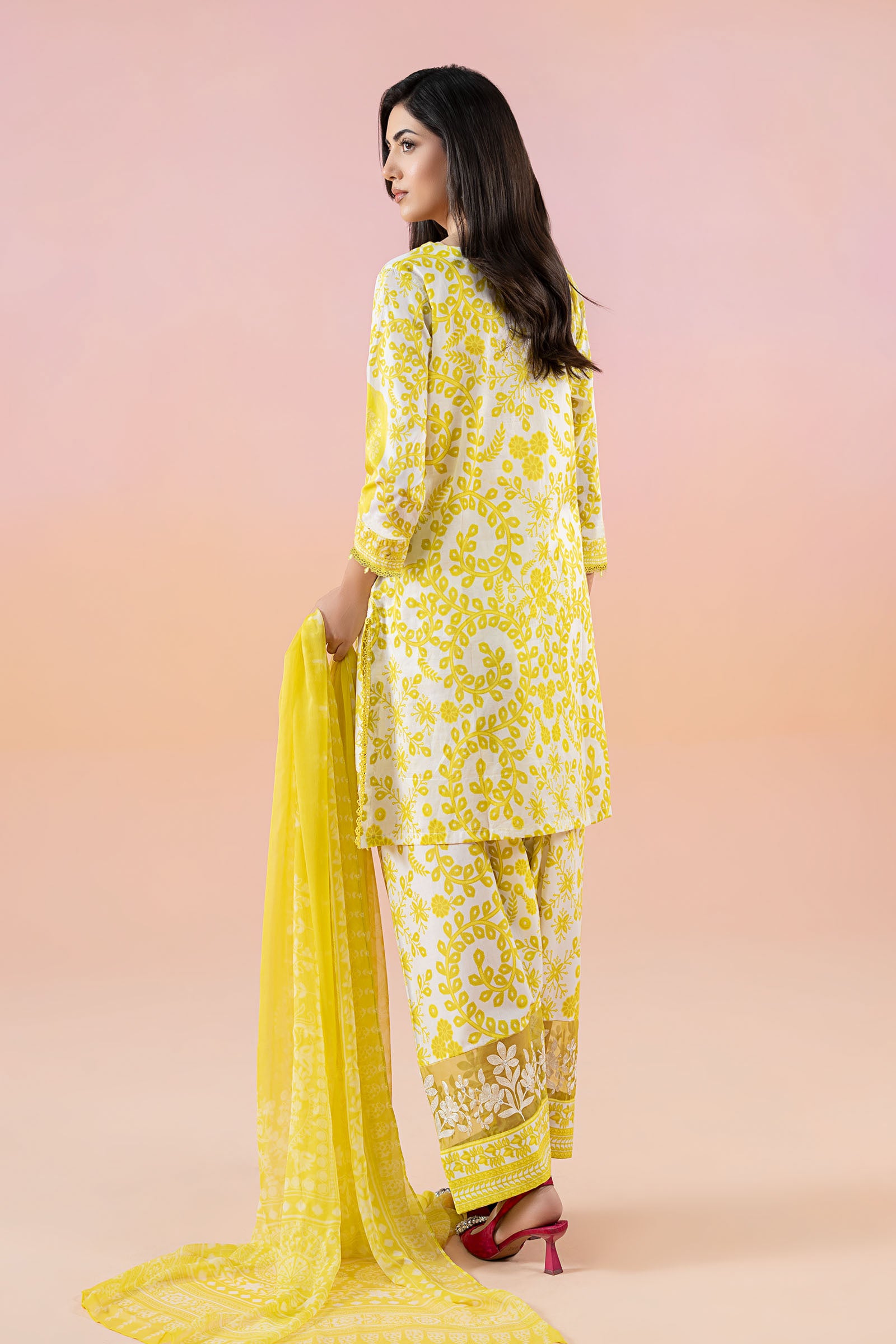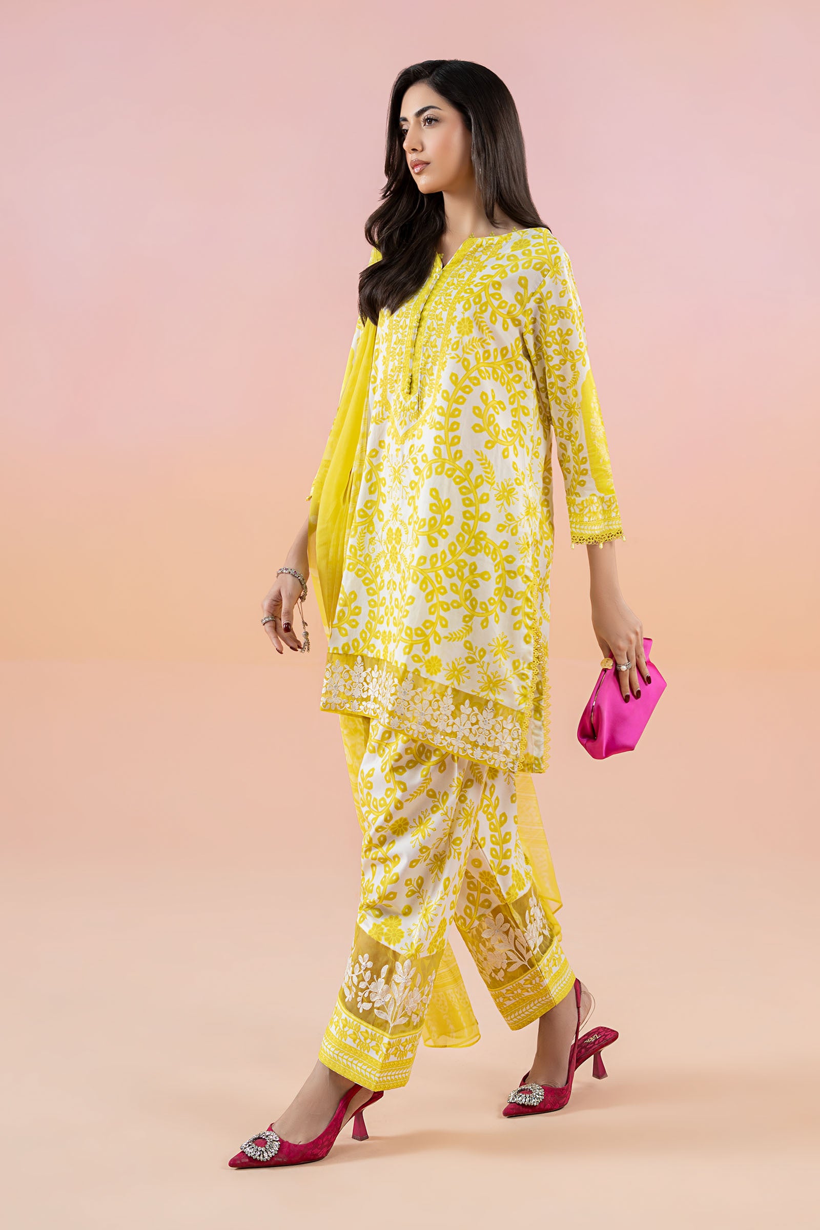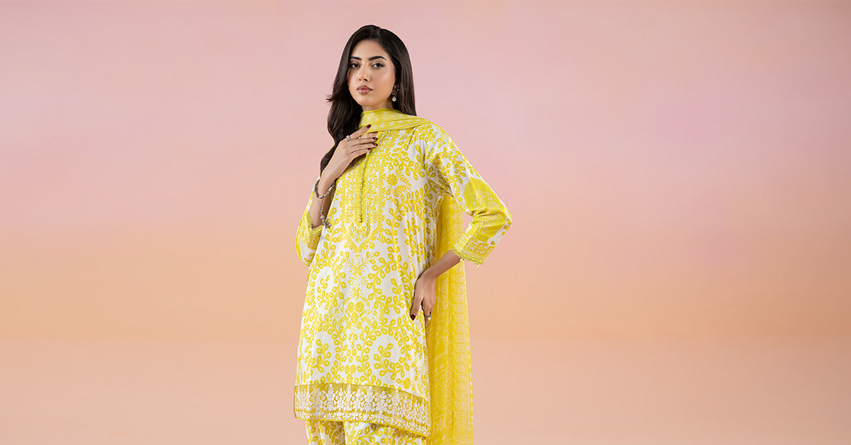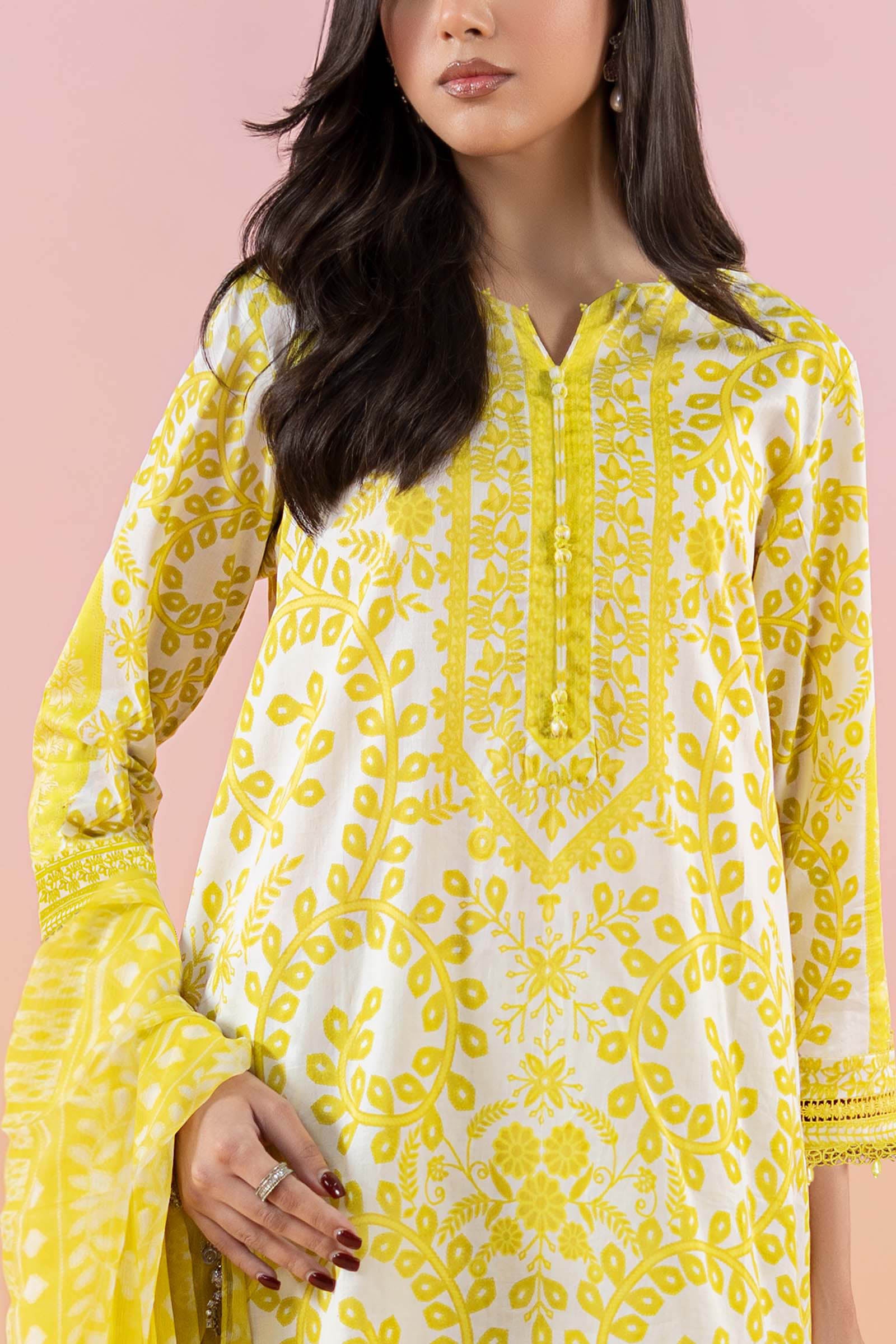 ShirtPrinted Straight-Cut ShirtRound Neckline With Loop-Buttons DetailingEmbroidered Organza BorderPrinted Sleeves With Lace & Pearls Detailing On BorderFabric: LawnColor: White & YellowShalwarPrinted ShalwarElasticated WaistbandEmbroidered Organza HemFabric: CambricColor: White & YellowDupattaPrinted DupattaFabric: ChiffonColor: White & YellowModel is wearing xs sizeNote: Dry Clean Only