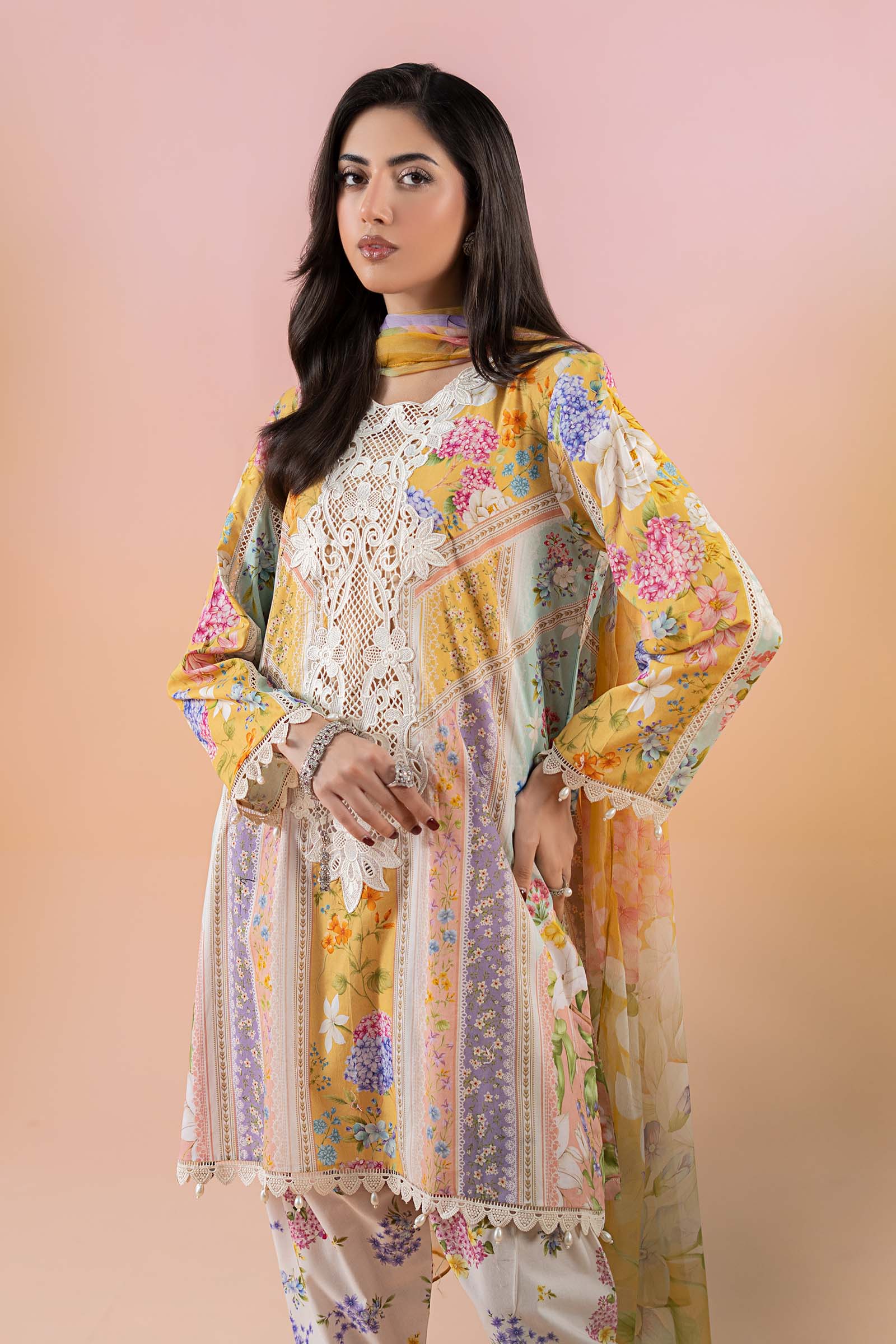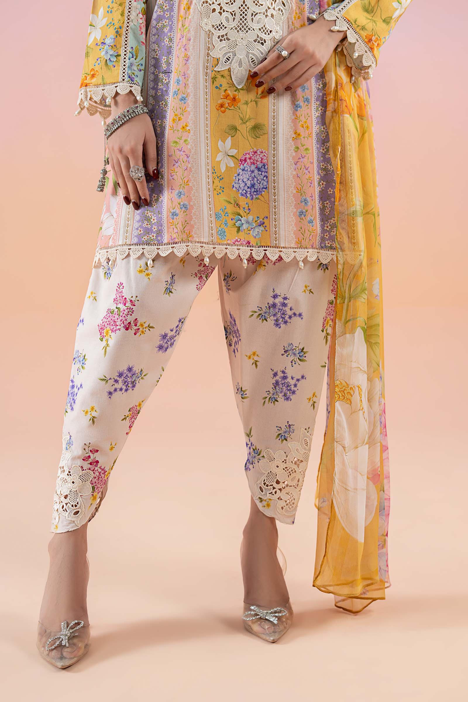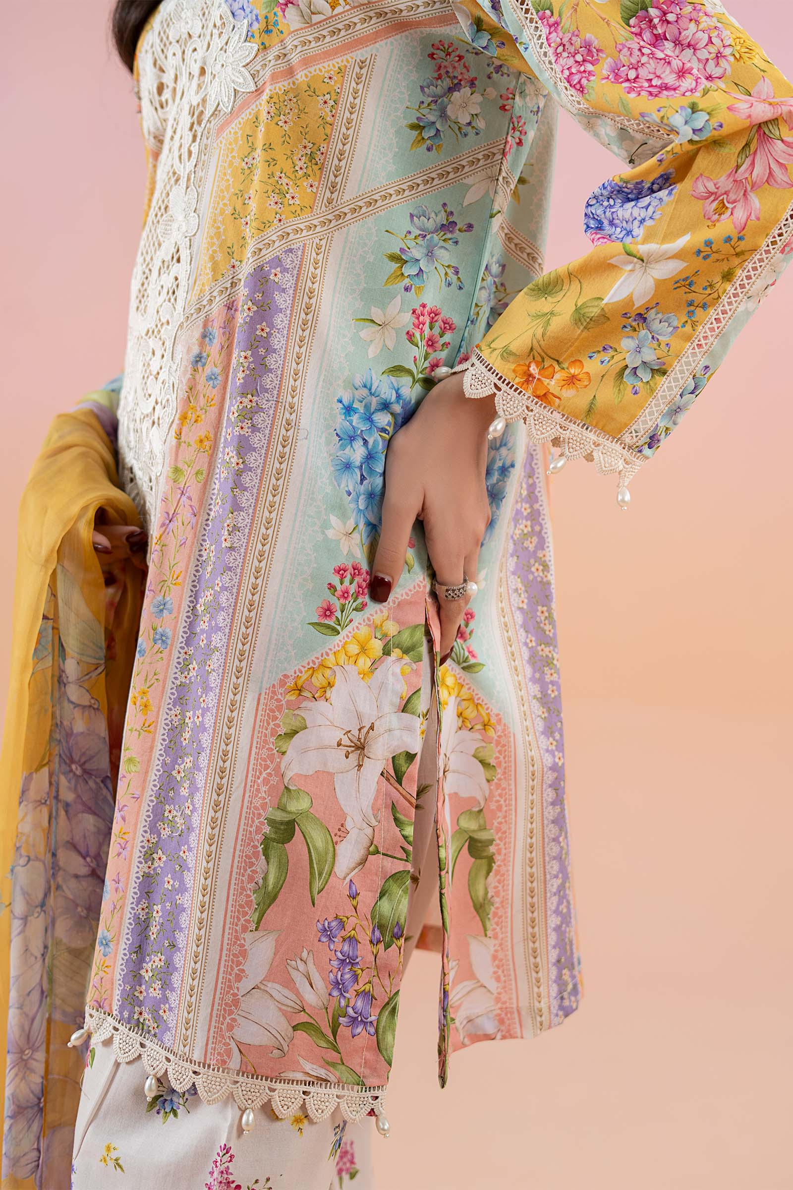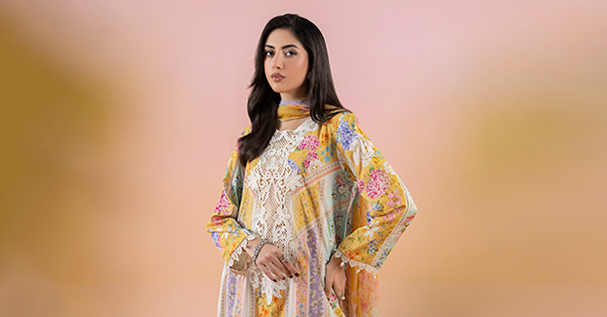 ShirtPrinted Straight-Cut ShirtEmbroidered Round NecklineLace & Pearl Drop Detailing On BorderPrinted Sleeves With Lace & Pearl Drop Detailing On BorderFabric: LawnColor: Mustard & PinkShalwarPrinted Tulip ShalwarElasticated WaistbandEmbroidered HemFabric: CambricColor: Mustard & PinkDupattaPrinted DupattaFabric: ChiffonColor: Mustard & PinkModel is wearing xs sizeNote: Dry Clean Only