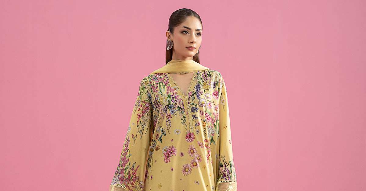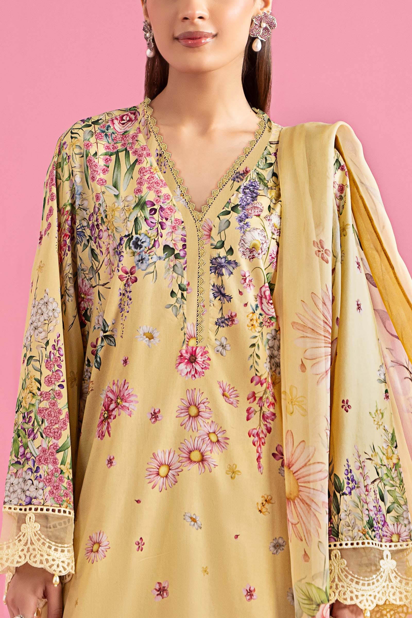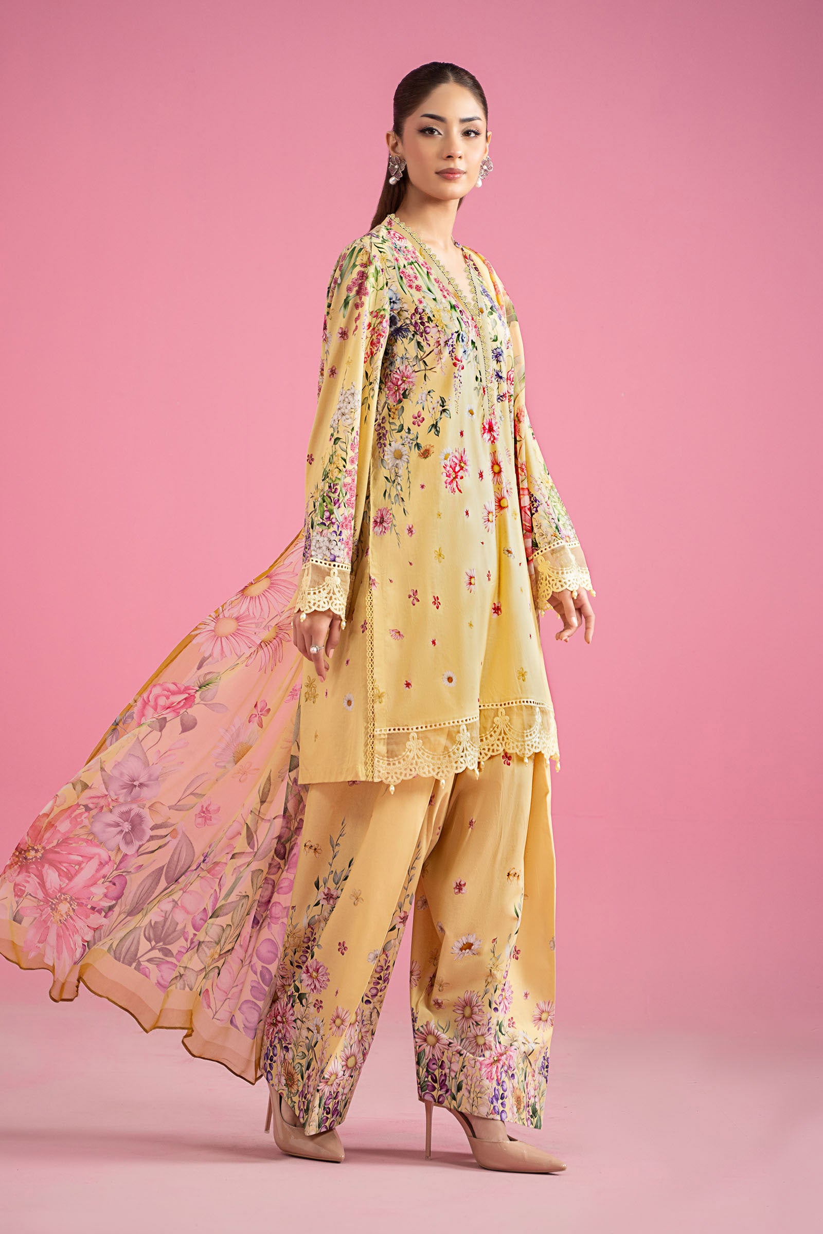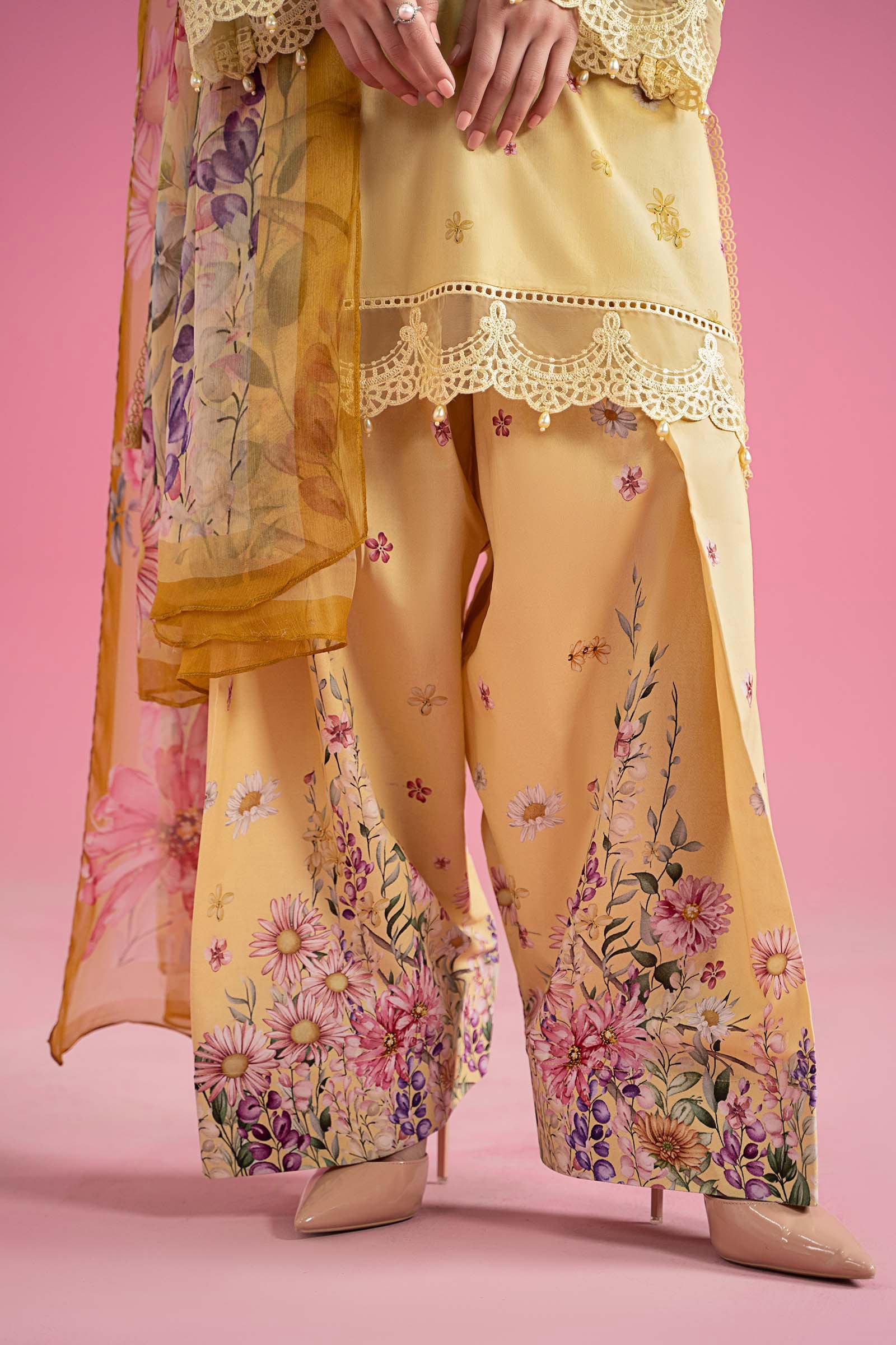 ShirtPrinted Straight-Cut ShirtOverlap Neckline With Lace DetailingOrganza Embroidered Scalloped BorderPrinted Sleeves With Organza Embroidered BorderPearl Drop Detailing On Sleeves & BorderFabric: LawnColor: YellowShalwarPrinted ShalwarElasticated WaistbandFabric: CambricColor: YellowDupattaPrinted DupattaFabric: ChiffonColor: YellowModel is wearing xs sizeNote: Dry Clean Only