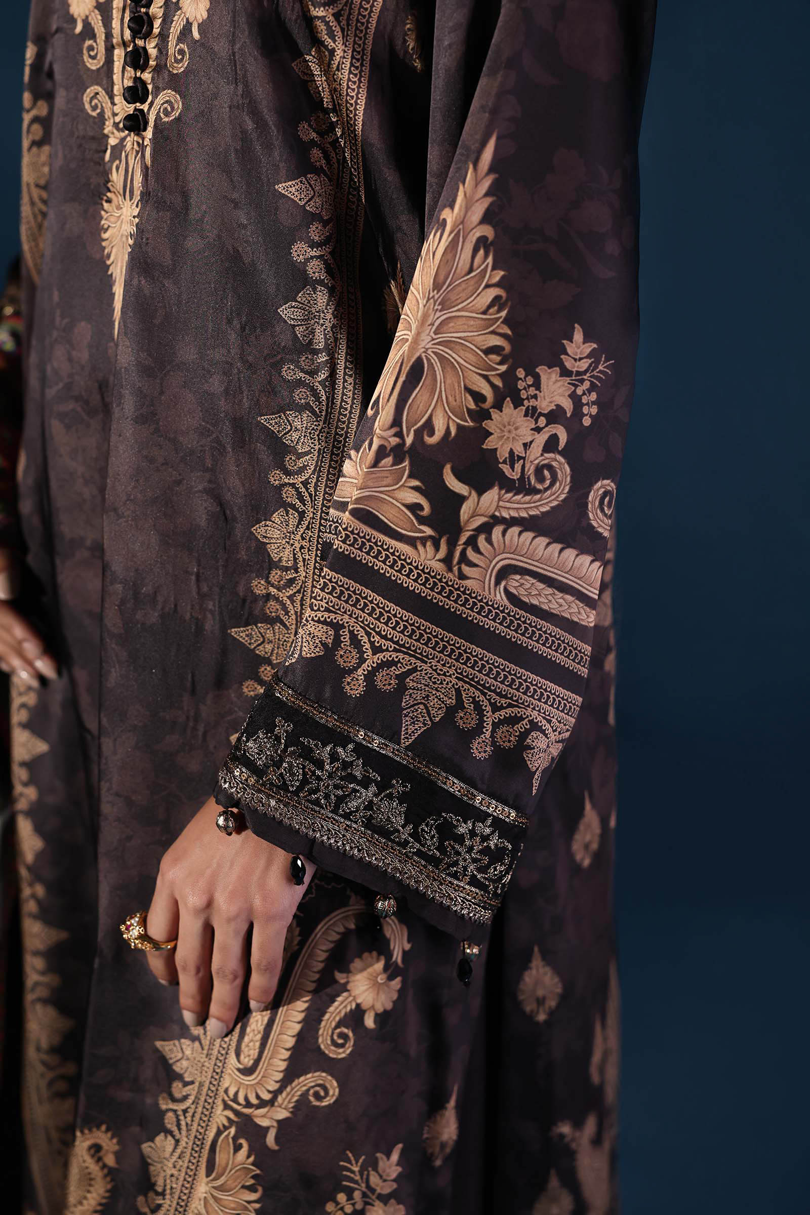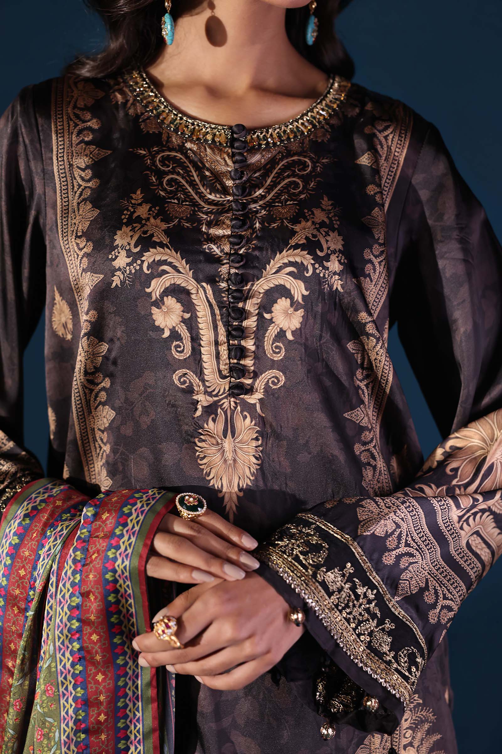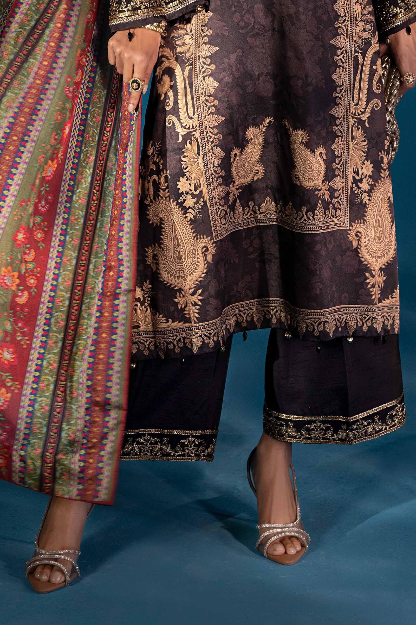 Shirt Printed Straight-Cut Shirt Hand-Embellished Neckline With Loop-Buttons Detailing Printed Sleeves With Embroidered Border Gotta & Pearl Drop Detailing On Sleeves & Border Fit: Regular Color: Black Fabric: Satin Silk Trouser Dyed Culottes Elasticated Waistband Embroidered Hem Fit: Regular Color: Black Fabric: Raw Silk Dupatta Printed Dupatta Color: Black Fabric: Medium Silk Work Details: Sequins, Tilla & Thread Embroidery Model is wearing xs size Note: Dry Clean Only