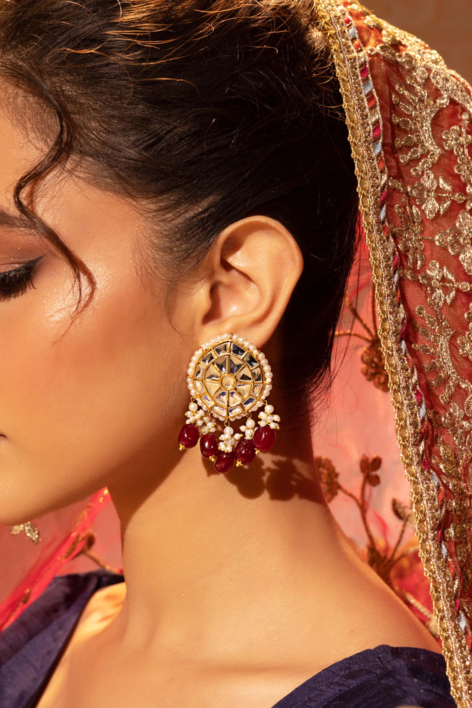 Traditional design, contemporary craftsmanship! These Onyx Stud Earrings showcase an antique oval motif, delicately embellished with a mixture of handcut white glass work. Completing the look to perfection, this masterpiece is finished with glistening pearls pyroi and red onyx stones, making it an excellent choice for your celebrations.