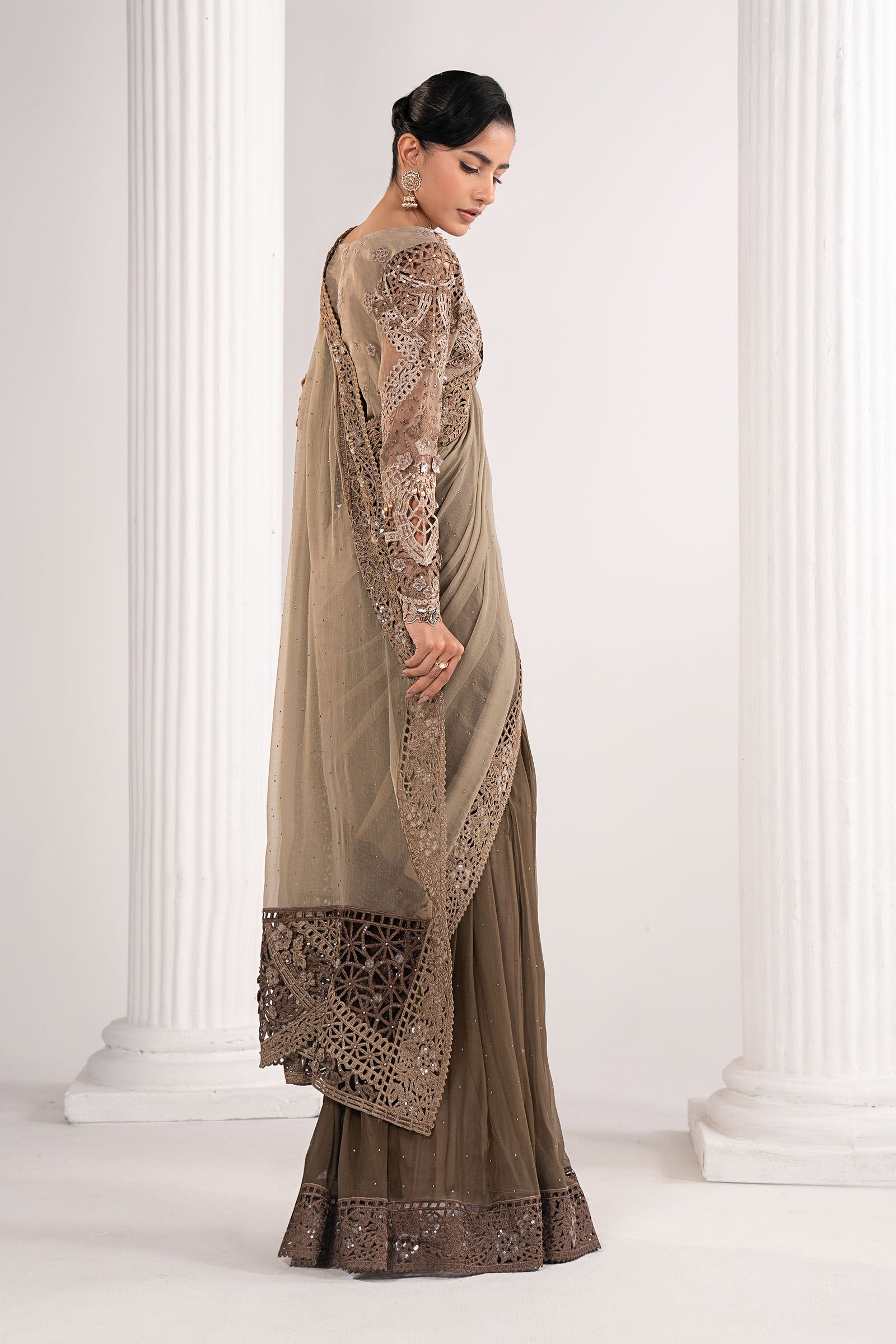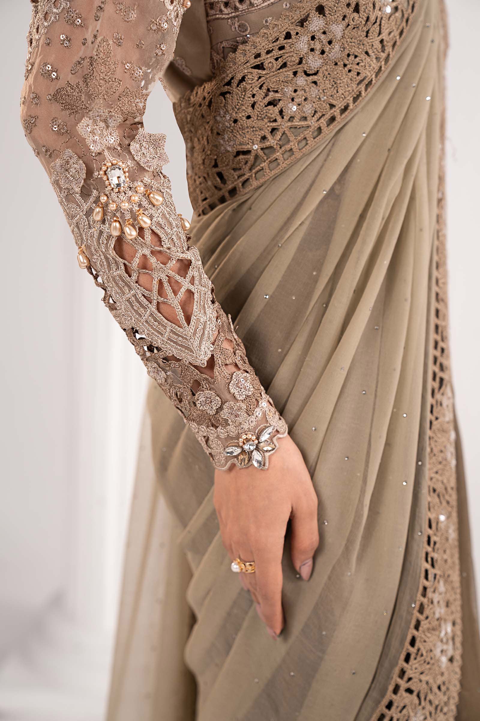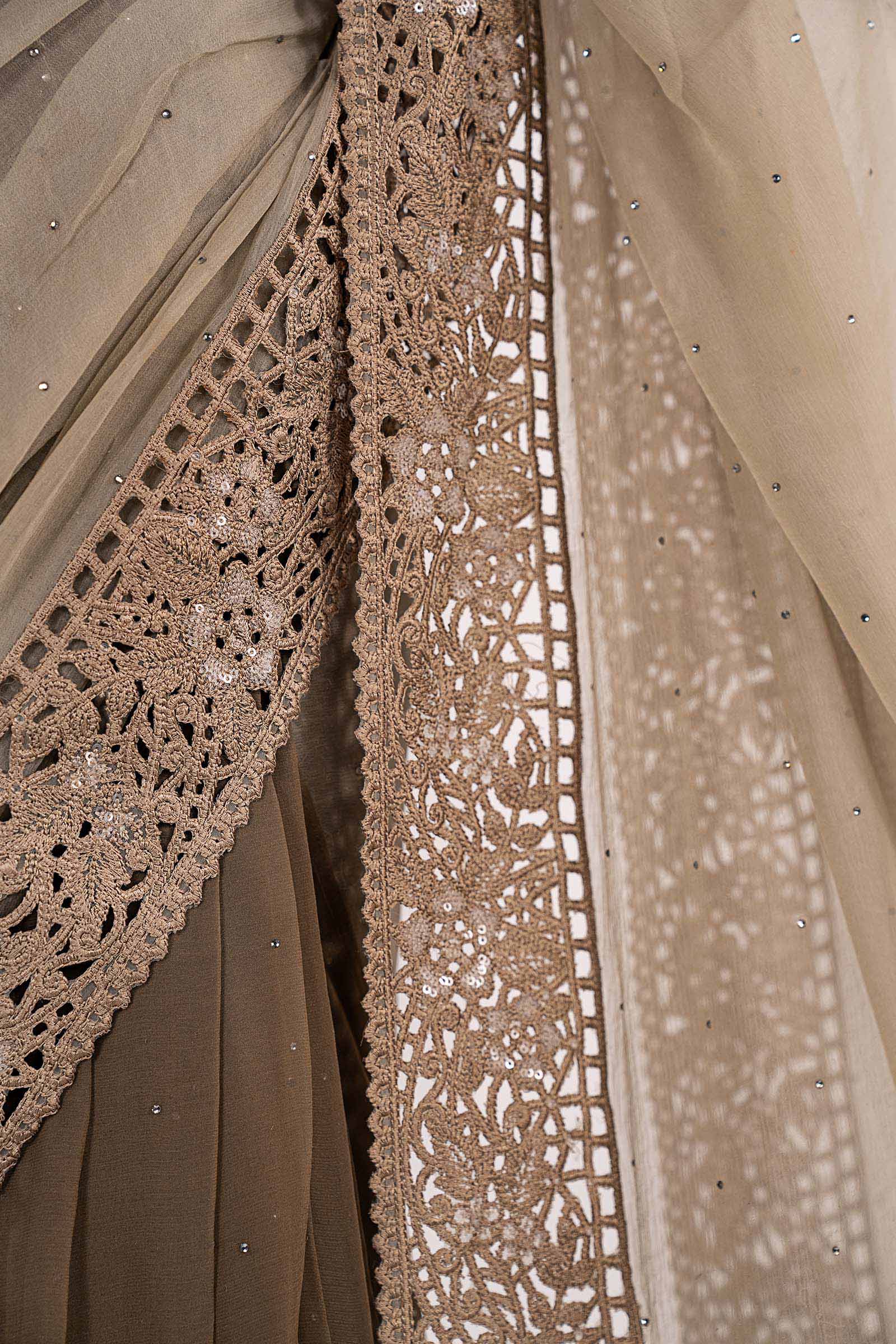 BlouseEmbroidered BlouseHand-Embellished Round NecklineEmbroidered Fitted Sleeves With 3D Flowers & Hand-EmbellishmentSleeveless Raw Silk Lining (Attached)Color: CoffeeFabric: OrganzaSareeDiamantes Embellished SareeEmbroidered Motif On Pallu BorderAll-Over Embroidered BorderAdjustable Hook WaistbandColor: CoffeeFabric: ChiffonPetticoat Dyed PetticoatDrawstring WaistbandColor: CoffeeFabric: Raw SilkModel is wearing xs sizeNote: Dry Clean Only