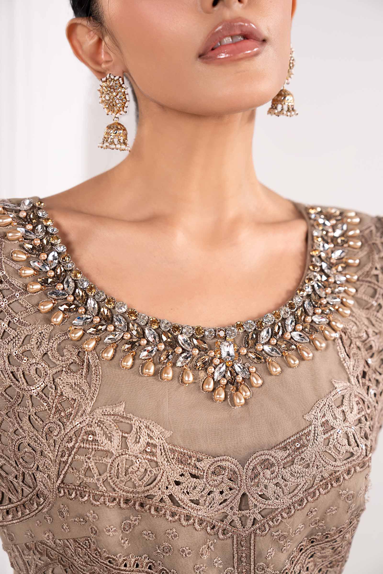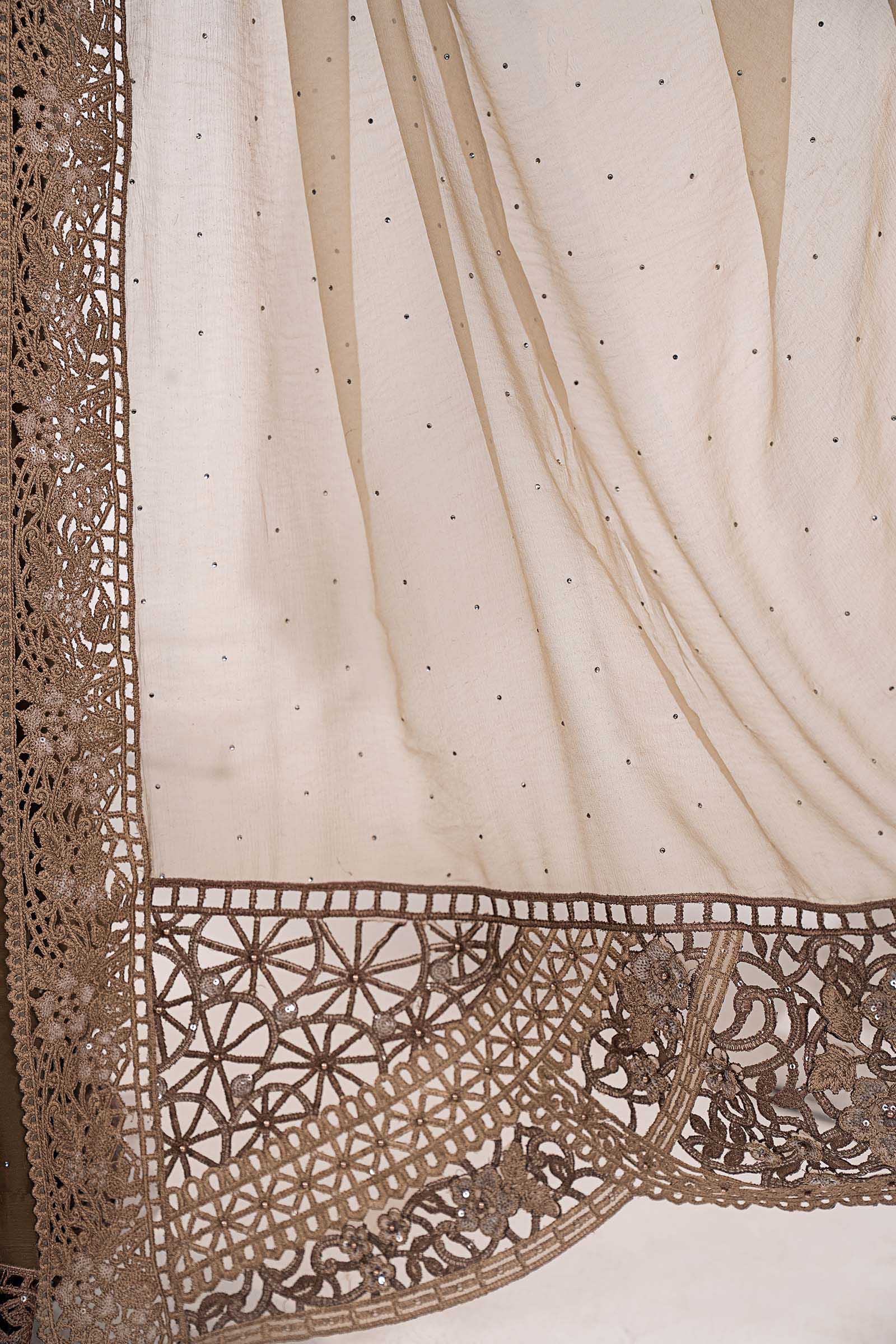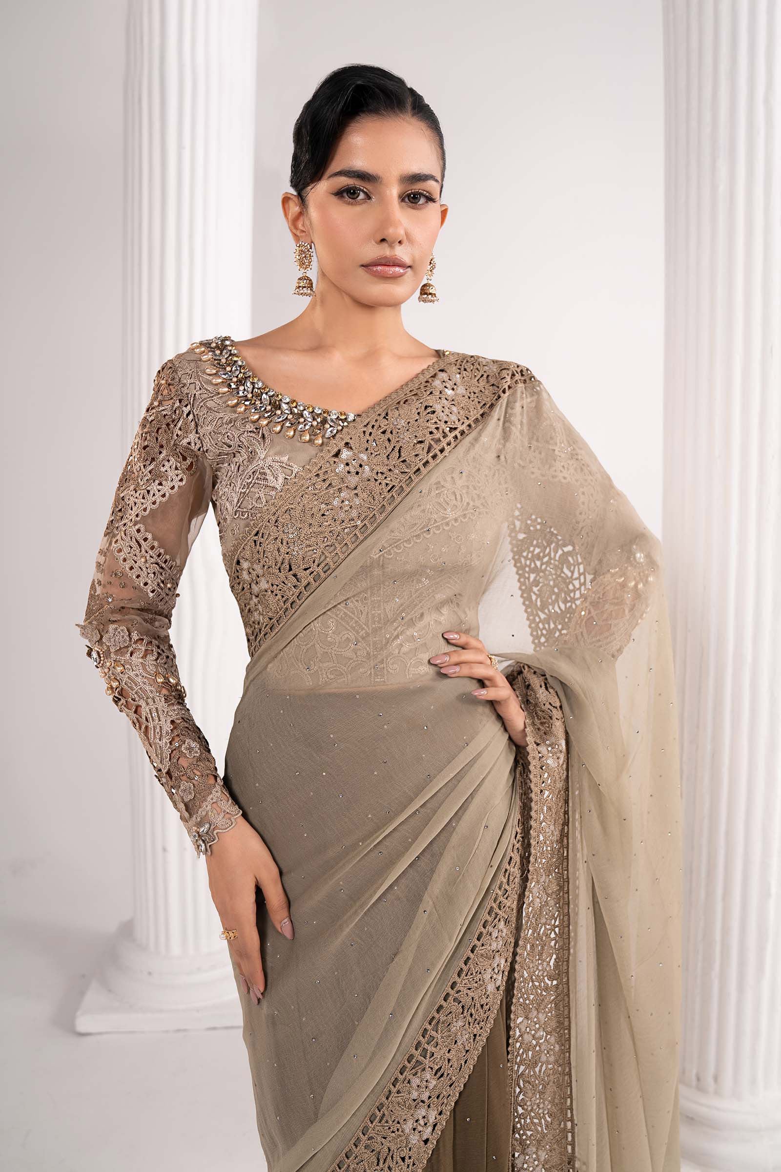 BlouseEmbroidered BlouseHand-Embellished Round NecklineEmbroidered Fitted Sleeves With 3D Flowers & Hand-EmbellishmentSleeveless Raw Silk Lining (Attached)Color: CoffeeFabric: OrganzaSareeDiamantes Embellished SareeEmbroidered Motif On Pallu BorderAll-Over Embroidered BorderAdjustable Hook WaistbandColor: CoffeeFabric: ChiffonPetticoat Dyed PetticoatDrawstring WaistbandColor: CoffeeFabric: Raw SilkModel is wearing xs sizeNote: Dry Clean Only