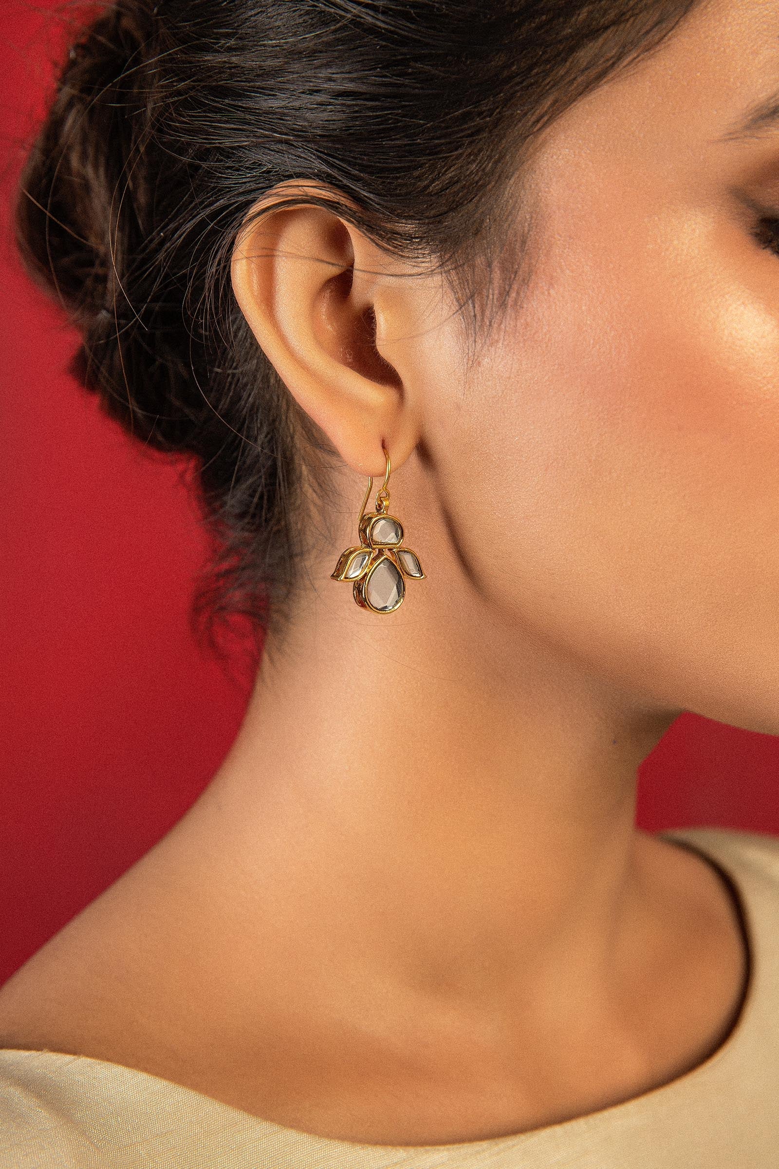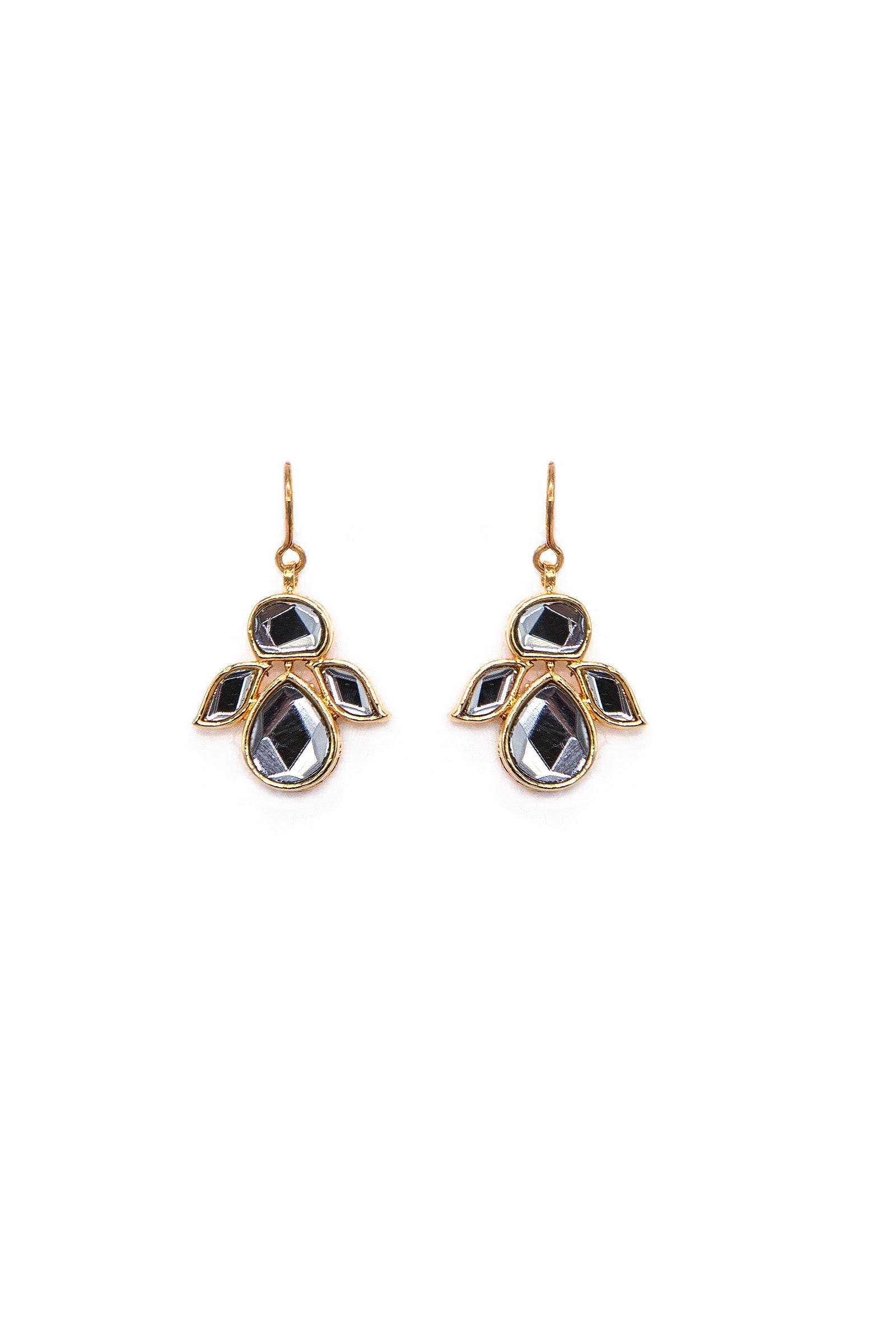 Add grace and glamour to your jewelry with these dangling fish hook pin earrings embraced with white handcut glass cutting stones in 21K gold plating. Alloy metal